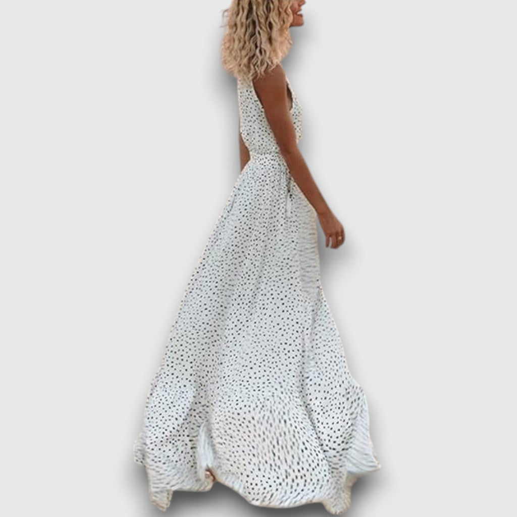 וibes בוהמייניות: הסילואט המאוורר והדפוס הנקודתי המשחקי משדרים אסתטיקה בוהו חופשית.