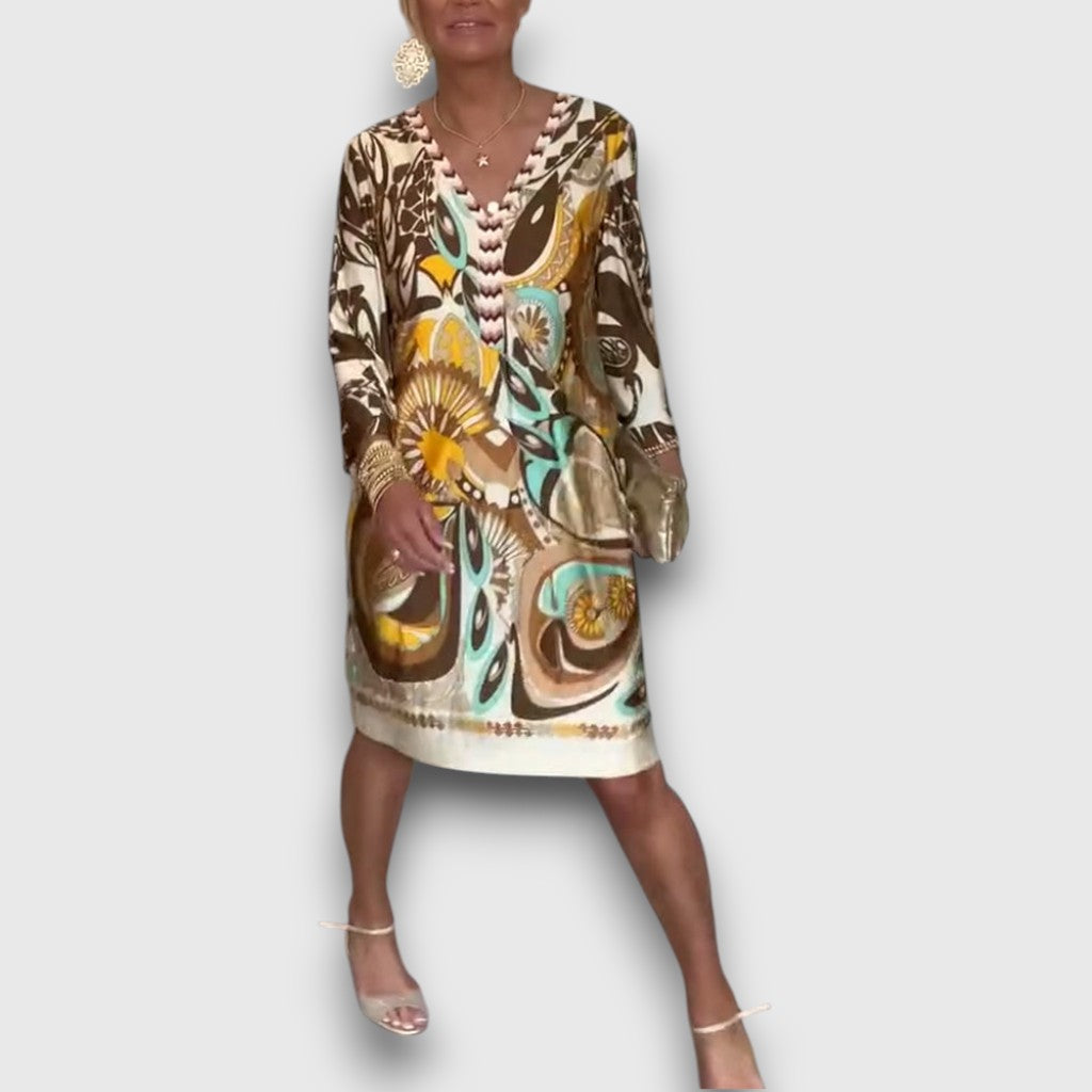 הארי את יומך עם המוני - שמלת הדפס קשת, חגיגה של שמש וביטוי עצמי. עם פלטת הצבעים הרטרו-בוהו והמוטיבים הדינמיים שלה, הסילואטה הקלילה הזו מביאה אישיות ועוצמה לכל תנועה שלך.