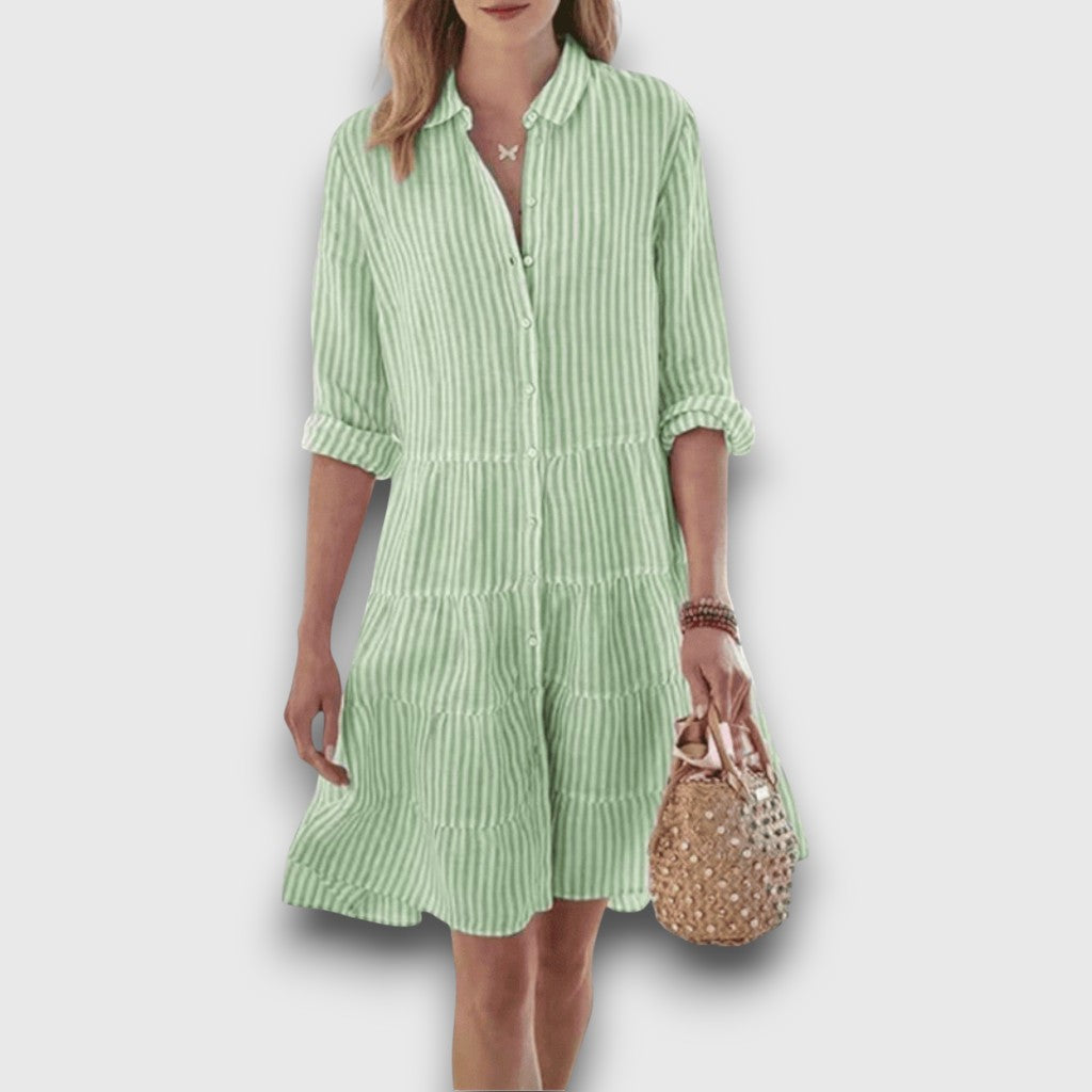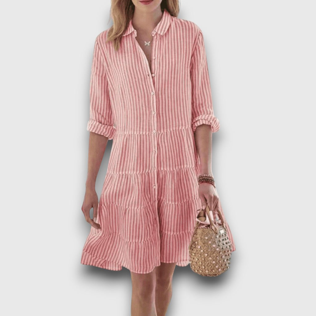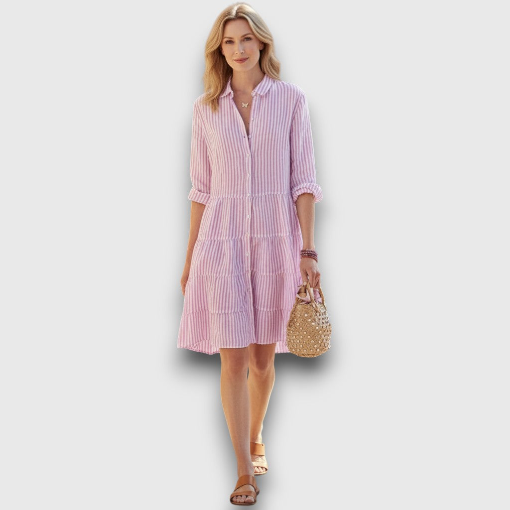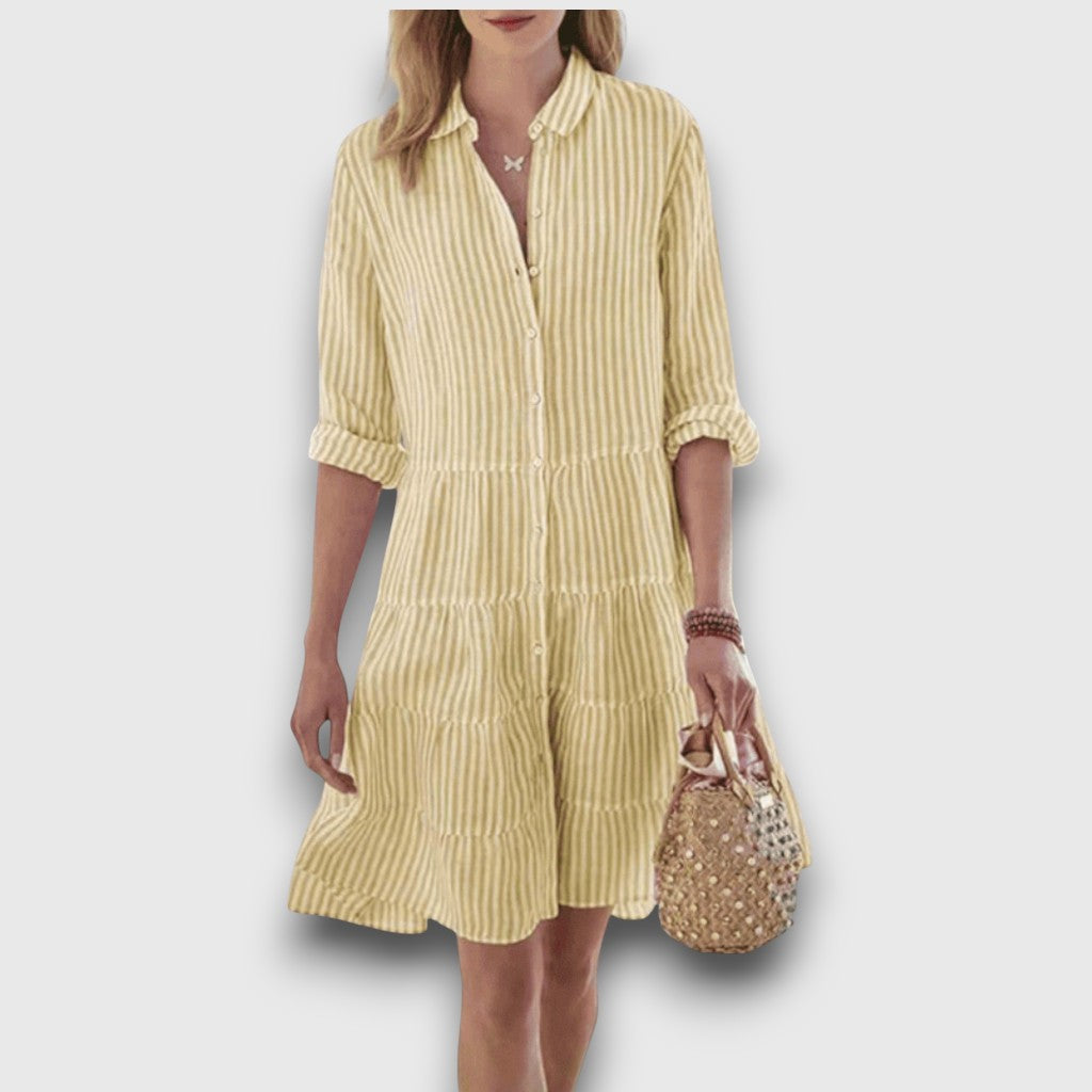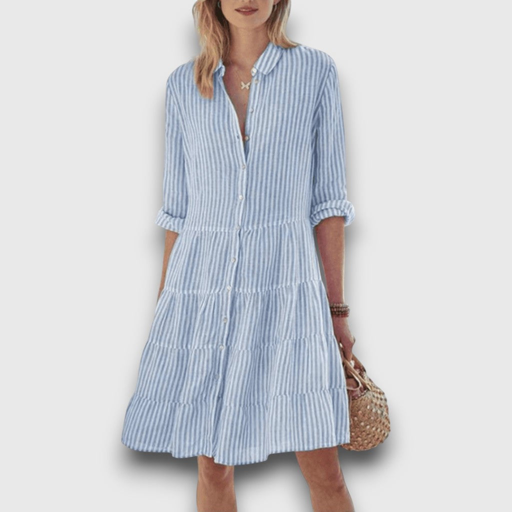 שמרי על קור רוח ומראה מסודר בשמלת נדיה - שמלת פסים קלילה, פריט קלאסי עם כפתורים מקדימה שמשלב נוחות יומיומית עם sophistication נינוחה. מושלמת לטיולים בשמש או לארוחות בוקר נינוחות, זו השמלה שתלבשי שוב ושוב.