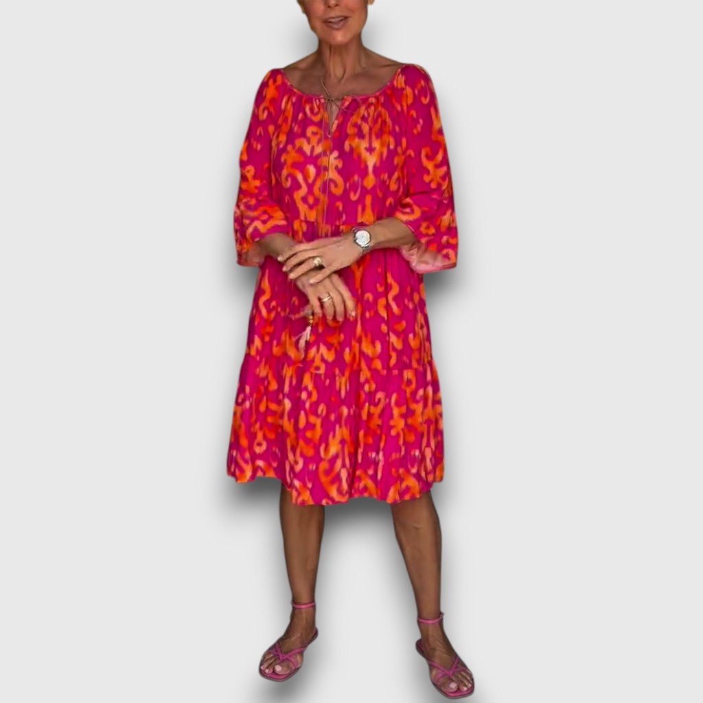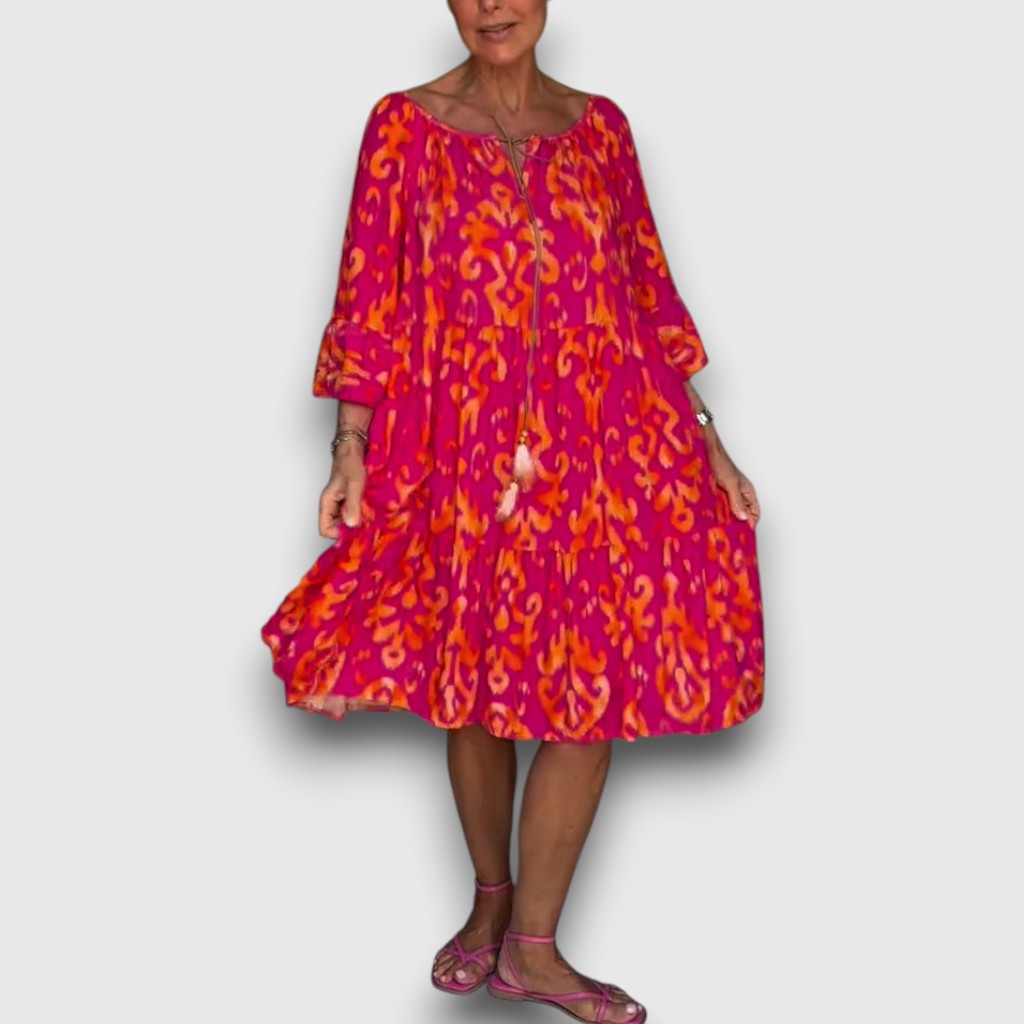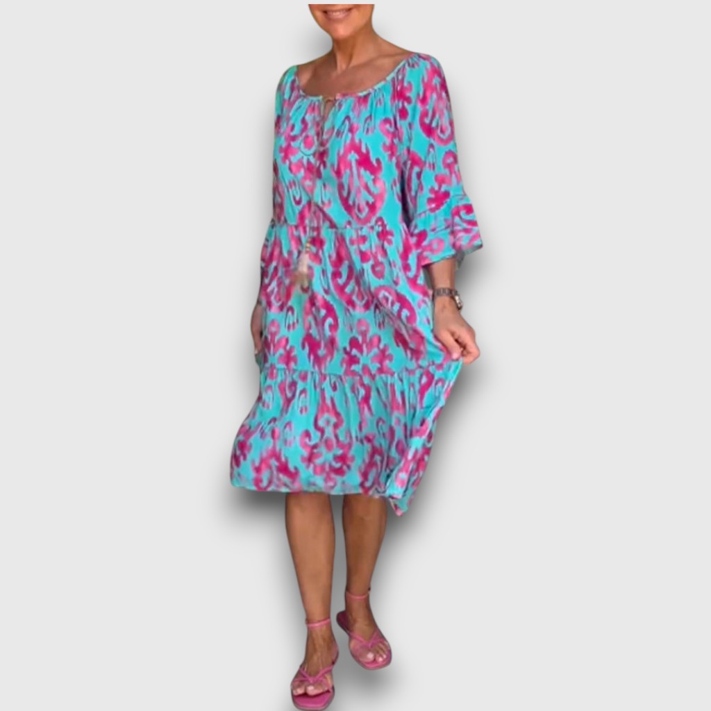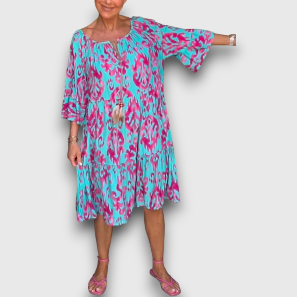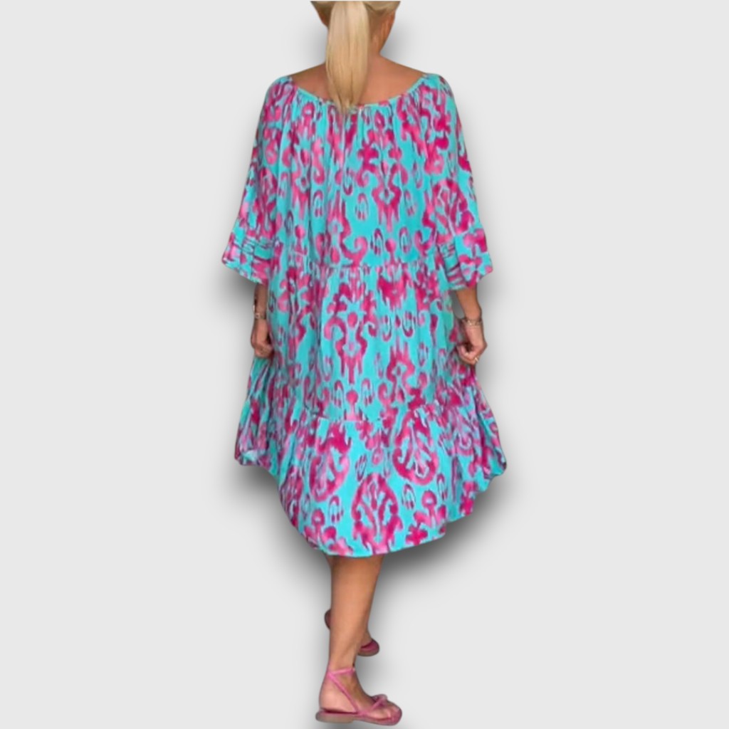 הוסיפו פיצוץ של נועזות לארון הבגדים שלכם עם ריקה - שמלת הדפסה רגועה, ביטוי שמח של נוחות וסגנון. הסילואט הרוחני והדפוס התוסס שלה עושים אותה הבחירה המושלמת לסופי שבוע נינוחים, חופשות שטופות שמש, או פשוט להרגיש נהדר בבית.