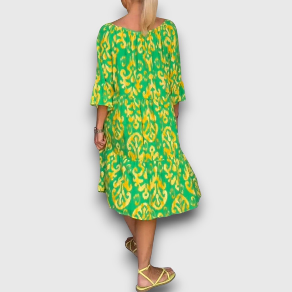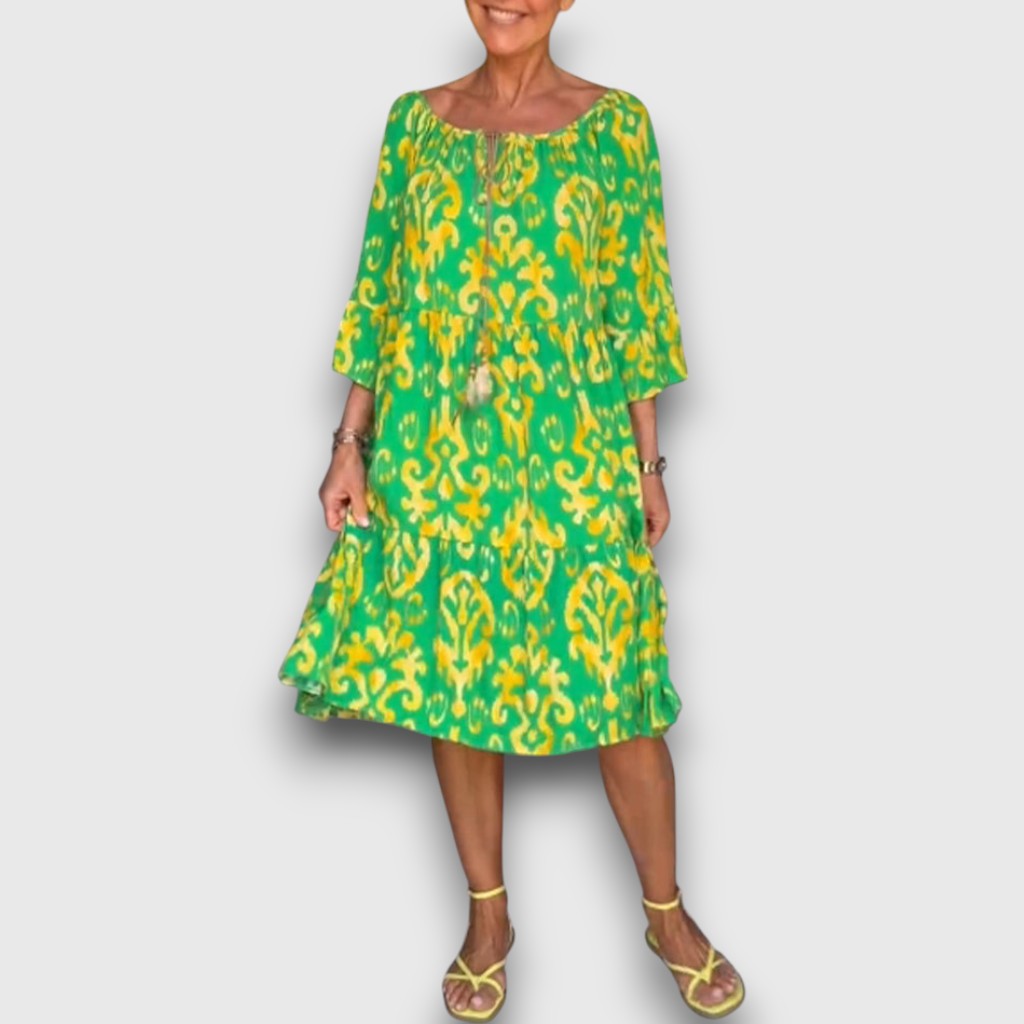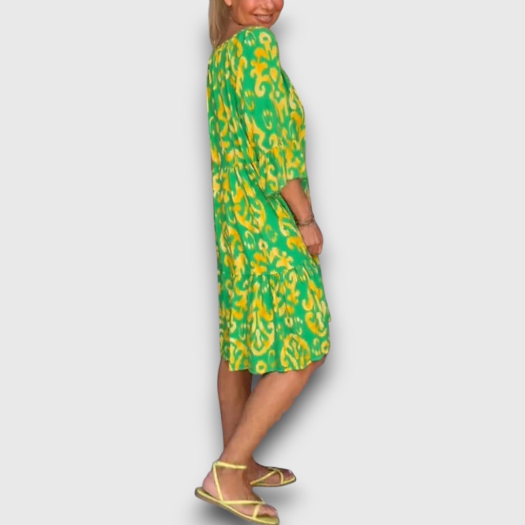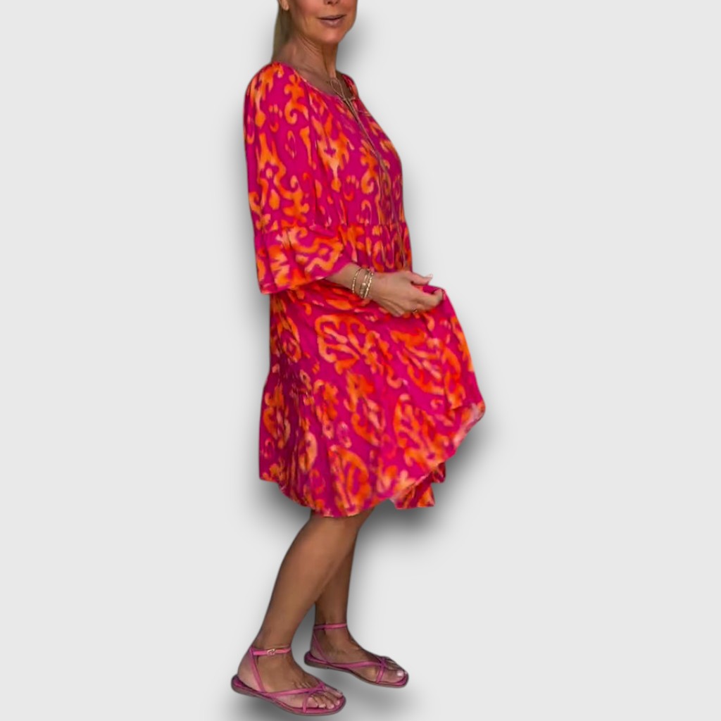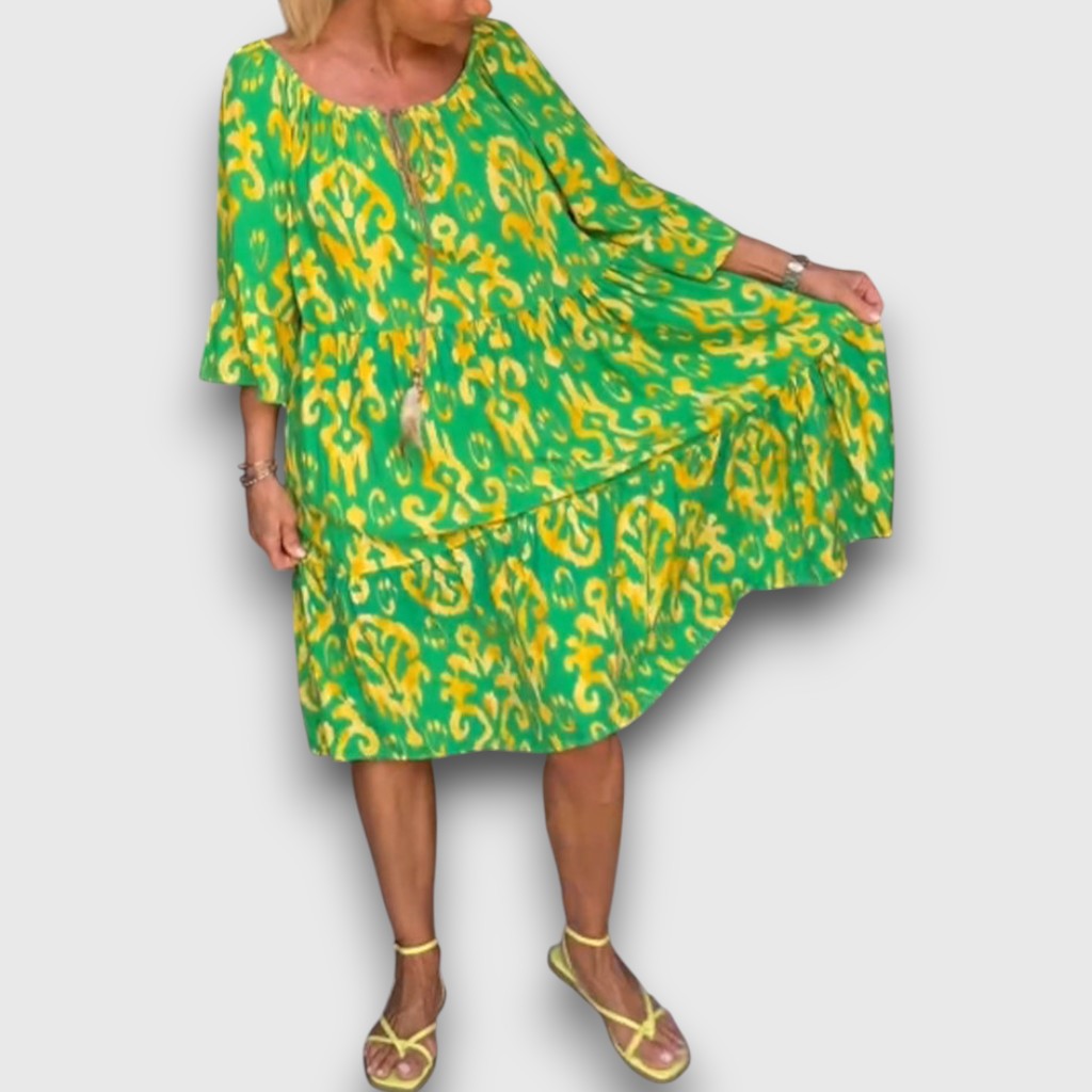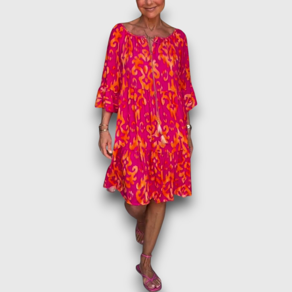 הוסיפו פיצוץ של נועזות לארון הבגדים שלכם עם ריקה - שמלת הדפסה רגועה, ביטוי שמח של נוחות וסגנון. הסילואט הרוחני והדפוס התוסס שלה עושים אותה הבחירה המושלמת לסופי שבוע נינוחים, חופשות שטופות שמש, או פשוט להרגיש נהדר בבית.